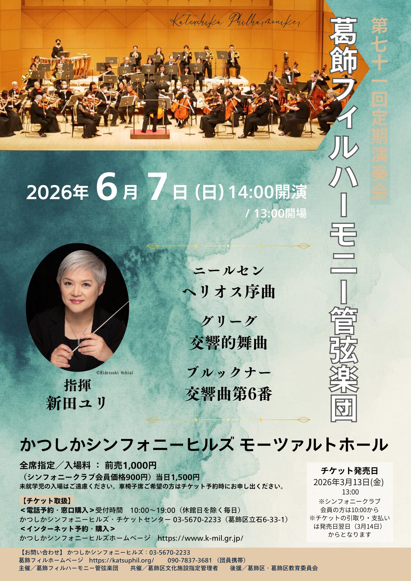 葛飾フィルハーモニー管弦楽団は、東京の東端に位置する、葛飾区で唯一のアマチュアオーケストラです。団員数は約70名、10代から80代まで、学生やサラリーマンなど、さまざまな年齢・職業の団員が在籍しています。活動拠点は、京成線青砥駅にほど近い『かつしかシンフォニーヒルズ』。区および葛飾区文化施設指定管理者からの支援を受け、練習場所・演奏会会場は常に確保されております。音響に定評のあるモーツァルトホールを演奏披露の場として利用でき、一流演奏家を指導者として毎回の練習に招聘するなど、非常に恵まれた環境で音楽に取り組むことのできるオーケストラです。
