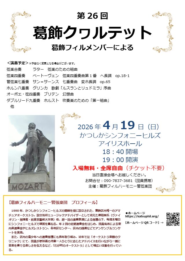 演奏会 定期演奏会 2026年06月07日(日) 第71回定期演奏会 開催日 2026年06月07日(日) 時間 13時00分開場/14時00分開演 場所 かつしかシンフォニーヒルズ モーツァルトホール 会場アクセス 指揮 新田ユリ 曲目 ニールセン:ヘリオス序曲 グリーグ:交響的舞曲 ブルックナー:交響曲第6番 拡大する くわしくみる その他の演奏会 2026年04月19日(日) 葛飾フィルハーモニー管弦楽団メンバーによる 第26回葛飾クヮルテット 演奏曲目・出演者は予告なく変更となる場合がございます。 開催日 2026年04月19日(日) 時間 18時40分開場/19時00分開演 場所 かつしかシンフォニーヒルズ アイリスホール 会場アクセス 拡大する くわしくみる 過去の定期演奏会 過去の定期演奏会 過去のその他の演奏会